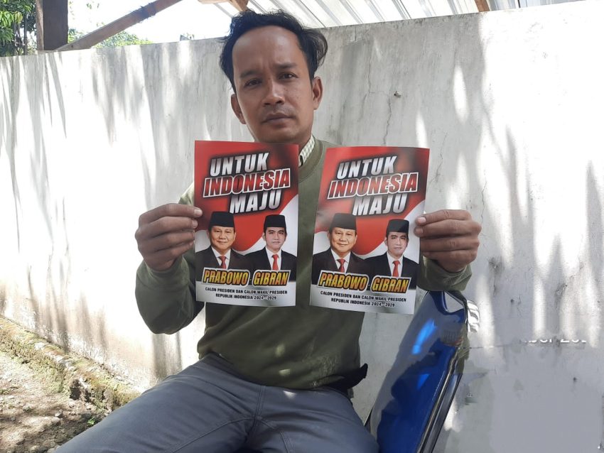 Sebagai apresiasi, relawan Bolone Mase Kudus membagikan poster dan memasang stiker Prabowo-Gibran kepada sejumlah tokoh pemuda dan warga di Kecamatan Bae, Kudus.