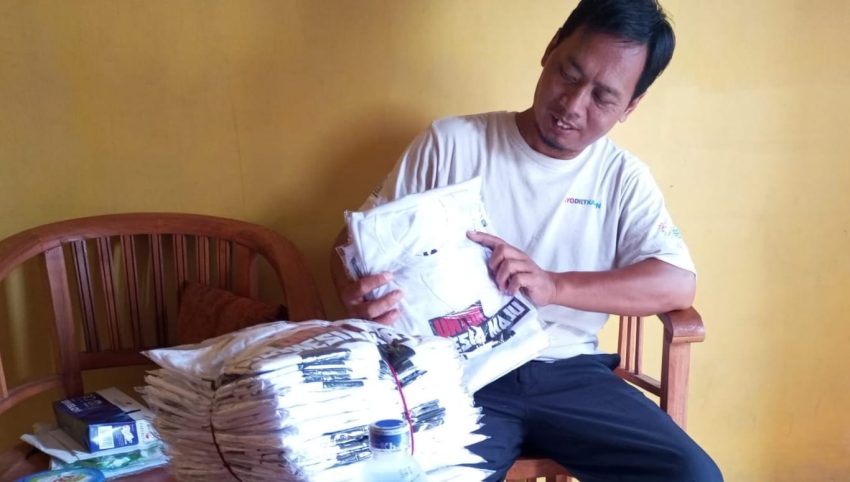 KUDUS – Tim Relawan Bolone Mase Kudus kembali membagikan ratusan kaos dan stiker pasangan Prabowo-Gibran.