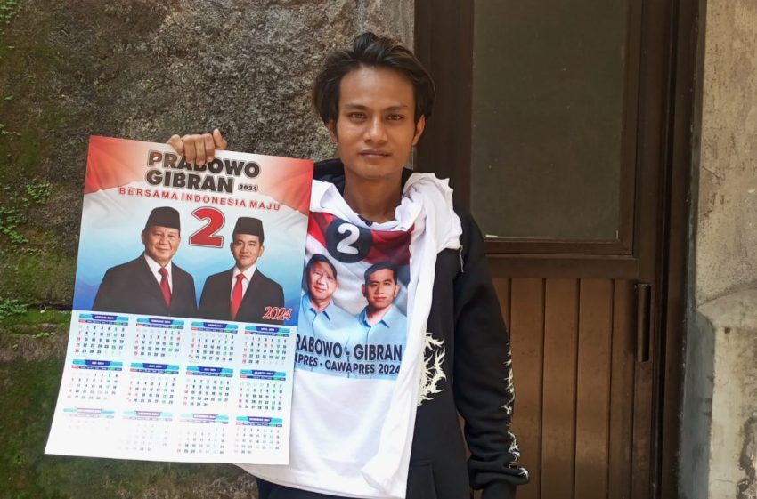 KUDUS – Relawan Bolone Mase salah satu pendukung Gribran Rakabuming Raka melakukan kegiatan bagi-bagi kalender dan kaos bergambar Prabowo-Gibran di kota Kudus, Jumat (29/12/2023).