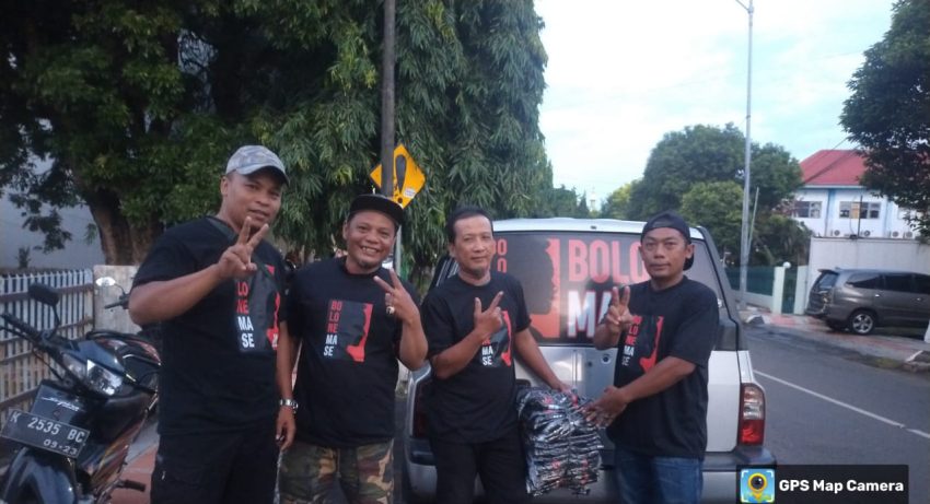 Belum ada lima menit, berlusin-lusin kaos langsung ludes. Tidak hanya kaos, ‘Bolone Mase’ juga membagikan selebaran yang berisi program dan visi-misi capres-cawapres Prabowo-Gibran.