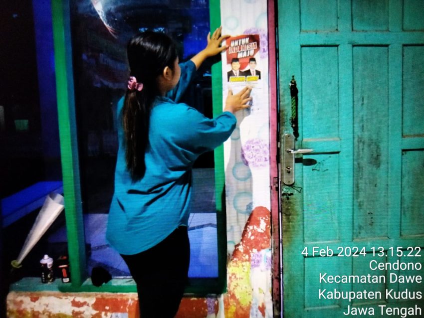 KUDUS – Relawan Bolone Mase Kudus menggelar aksi bagi-bagi stiker kepada masyarakat. Para relawan melakukan aksi itu dengan mendatangi rumah-rumah warga untuk menempelkan stiker Prabowo-Gibran di pintu-pintu rumah warga, Minggu (4/2/2024).