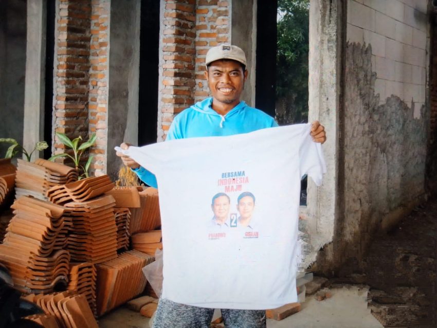 KUDUS – Relawan Bolone Mase Kudus salah satu pendukung Gribran Rakabuming Raka melakukan kegiatan bagi-bagi kaos bergambar Prabowo-Gibran, Senin (29/1/2024).