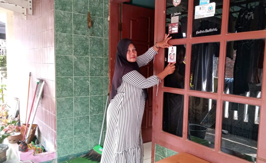 KUDUS – Relawan Bolone Mase Kudus menempelkan Stiker bergambar Prabowo-Gibran di rumah-rumah warga. Para relawan mendatangi secara door to door untuk membagikan ratusan stiker, Selasa (23/1/2024).